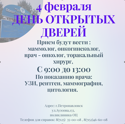 4 февраля 2023г. в нашем онкоцентре будет проводиться День открытых дверей, посвящённый Международному дню борьбы против рака.