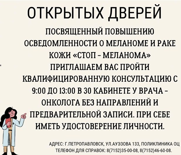 В пятницу, 26 мая 2023 года в поликлинике онкологического центра проводиться День Открытых Дверей посвящённый повышению осведомленности о меланоме и раке кожи "Стоп - Меланома!". Приглашаем пройти квалифицированную консультацию с 9:00 до 13:00 часов в 30 кабинете у врача - онколога без направлений и без предварительной записи. При себе иметь удостоверение личности. Наш адрес: г.Петропавловск, ул.Ауэзова 133, поликлиника ОЦ.